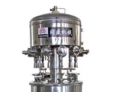 本机为回转式结构,全自动有进出瓶拨轮,半自动人工上下瓶。本机采用重力原理,灌注阀定量灌装,工作时液体将注阀充满,瓶托顶着待灌装的瓶子上升,然后,关闭上灌装阀,打开下灌装阀,液体由下灌装阀流入瓶内,以达到灌装的目的。灌装完毕后,瓶子随瓶托下降出瓶,进入下道工序。